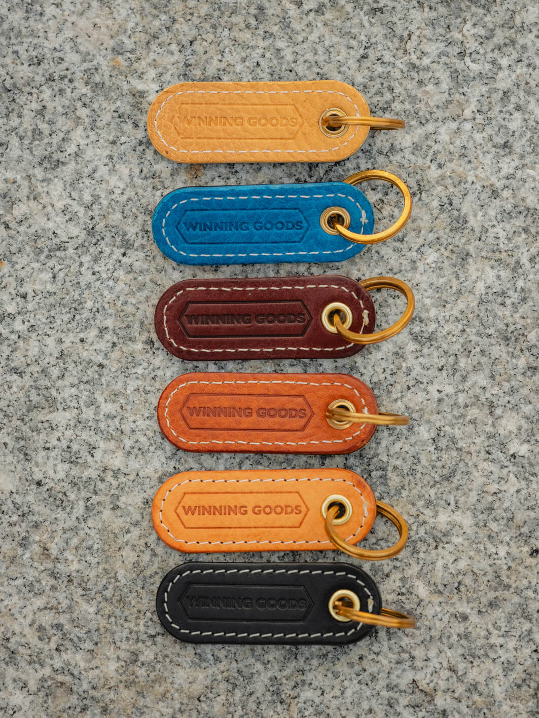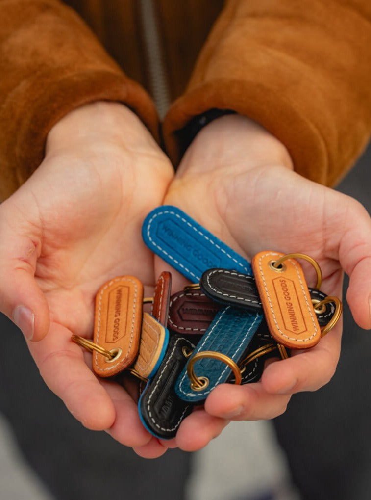 Introducing our Small Leather Key Fob with a unique blend of colourful 2-tone veg-tan leather. Each piece is a one-of-a-kind creation, showcasing the distinctive Winning Goods logo on both sides. This compact accessory boasts solid brass hardware for enduring quality and style.